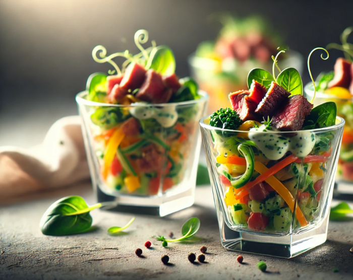 Ну и конечно, какое же застолье без салатов. Всеми любимое оливье или цезарь с курицей на стол можно подать не традиционно в салатницах, а в стаканчиках или в баночках. В них же добавить маленькие прозрачные вилочки или ложечки, для удобства гостей.