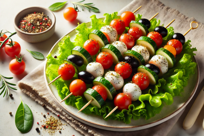Перед приготовлением обязательно обработайте овощи. Помидоры нарежьте пополам, огурец - кольцами (полукольцами), а брынзу - кубиками. По дольке ингредиенты насаживайте на шпажку, и в конце добавляйте немного салата.