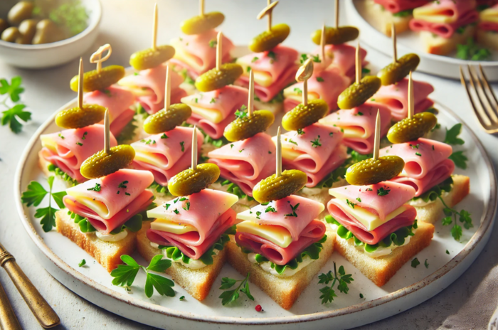 Наверно самый распространенный вариант канапе это с колбасой (ветчиной) и сыром. Интерпретаций множество вот одна из них.