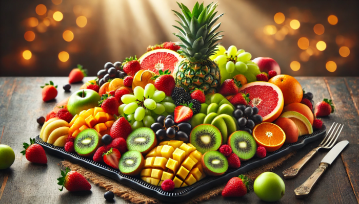 И так подытожим: на свой фуршетный стол мы уже добавили: канапе, тарталетки, пирожки, круассаны, сэндвичи. Для украшения стола можно использовать свежие фрукты в нарезке или в корзине.