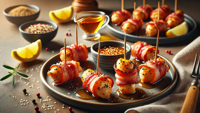 Порционно на небольших тарелочках можно подать такую горячую закуску, как куриное филе, запеченное в беконе. Для удобства гостей их можно насадить на шпажки.