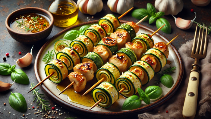На праздничных столах как фуршетных, так и банкетных популярная закуска - это шашлычки. Они могут быть из овощей, рыбы или мяса. Предлагаем вам приготовить по рецепту шашлычки с цукини и курицы.