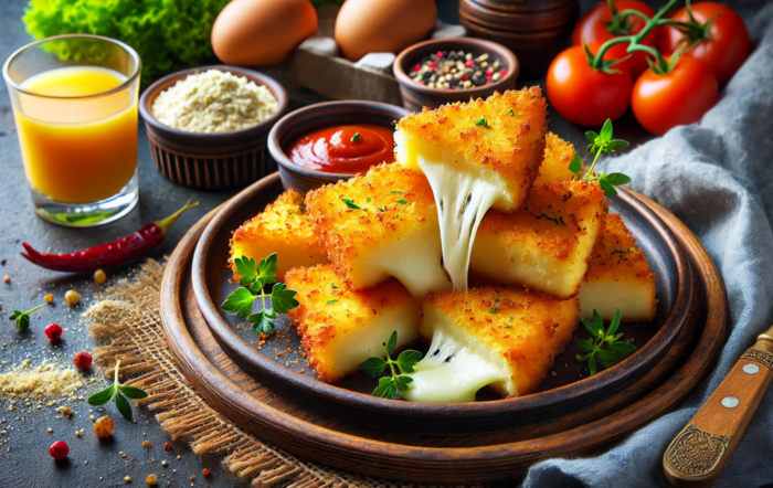 Нарезать сыр на произвольные кусочки, например, треугольники и обвалять их в панировке, чтобы не остались пустые участки. Далее обжарить в масле до появления золотистого цвета и хрустящей корочки.