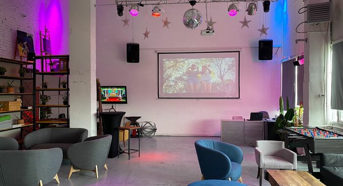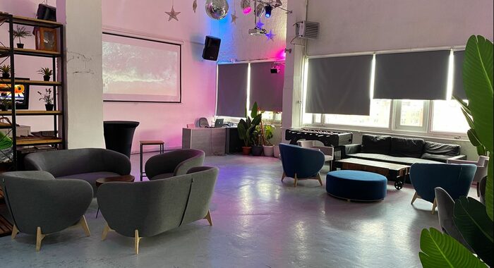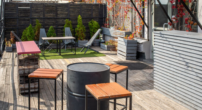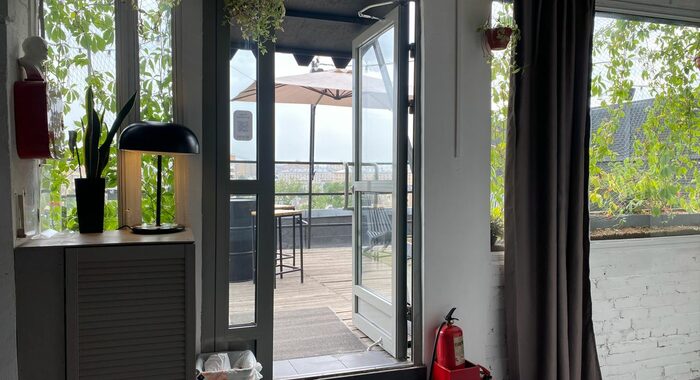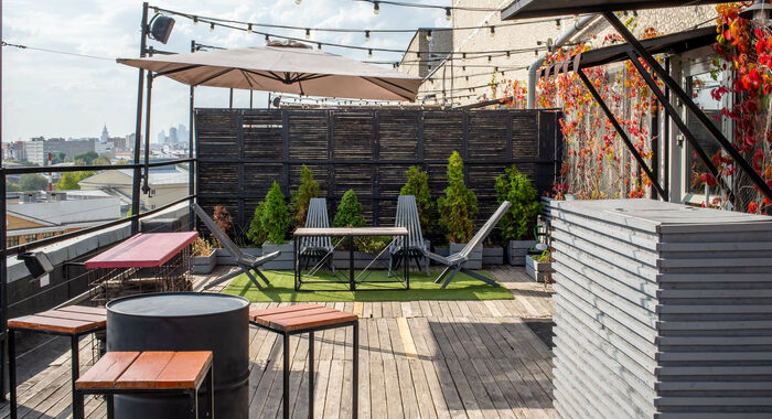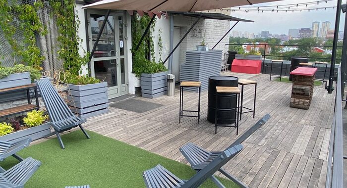 Пространство лофта зонировано на несколько уютных уголков с мягкой мебелью: пуфы, подушки, диваны и стильные кресла создают атмосферу уюта и комфорта. На крыше лофта гостей ждёт просторная веранда с захватывающим видом на город.