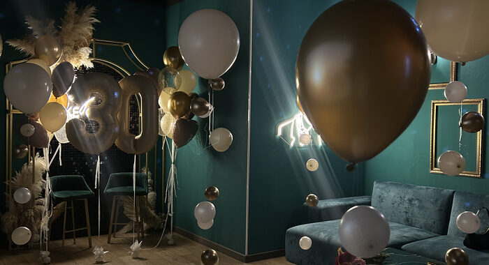 Если пространство ограничено, используйте декор, который крепится на стены или подвешивается к потолку. Например, геометрические панели, тканевые драпировки или блестящие шторы.