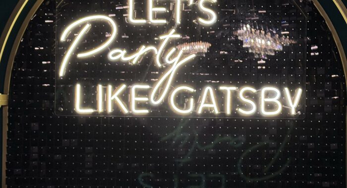 Создайте фотозону с большим золотым фоном надписи «The Great Gatsby». Добавьте перья, зеркальные элементы, искусственный мех и позолоченные рамки.