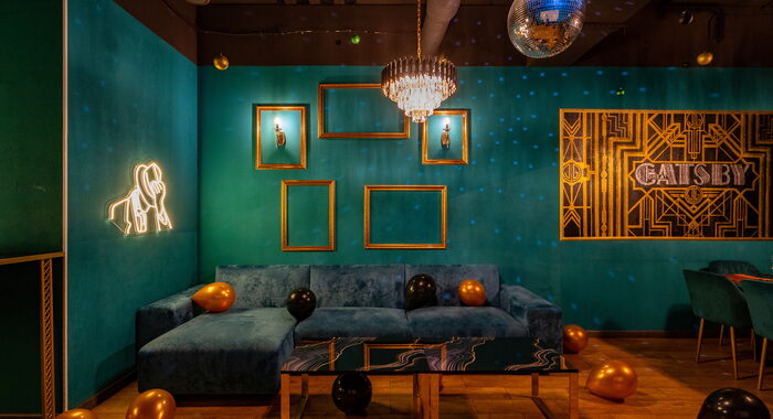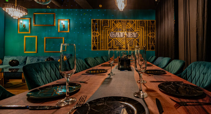 - Детали: винтажные граммофоны, шампанское в высоких бокалах, искусственные жемчужные ожерелья и книги эпохи джаза.