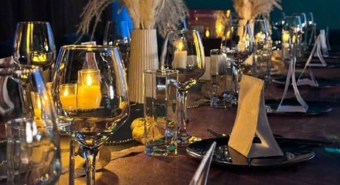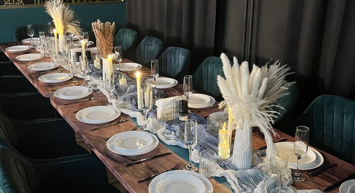 - Персонализированные элементы: закажите карточки с именами гостей в стиле ар-деко, используя винтажные шрифты. Можно добавить их на тарелки или прикрепить к бокалам.