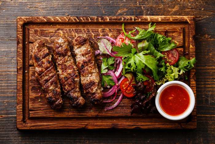 Это блюдо на праздниках готовят довольно редко - его приготовление довольно трудоемкое, но оно того стоит. Для люля-кебаба нужно мясо, обязательно свежее, не замороженное (любой вид), сало, которое делает фарш вязким (нутряное сало или курдючный жир), зелень, специи и лук по вкусу, но лучше не доложить, чем переборщить. Мясо и зелень рубят ножом на мелкое кусочки, сало можно пропустить через кухонный комбайн. Затем фарш перемешивается и обязательно «выбивается», то есть комок фарша нужно с силой кидать в миску в течение примерно 10 минут, чтобы достигнуть правильной консистенции (можно приготовить фарш заранее, чтобы не тратить время на празднике). Жарить люля-кебаб лучше на мангале, но, если вы не уверены в плотности своего фарша, то можно воспользоваться и решеткой. Фаршем облепляются стандартные шампуры, деревянные шампуры или бамбуковые палочки для шашлыка. Фарш нанизывается или налепляется на них в виде колбасок. Люля-кебаб нужно часто переворачивать, чтобы колбаски покрылись аккуратной корочкой.