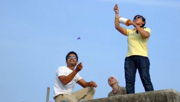 На праздник меня пригласили мои друзья, я не очень понимала, что будут за день, но сразу заметила, что все улицы и магазинчики завалены бумажными воздушными змеями и всяческими товарами для их запуска. Я купила пару змеев, и очень удивилась, когда увидела, что все остальные закупают змеев десятками. А потом мы целый вечер привязывали к ним веревочки.