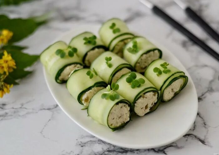 Помимо свежих овощей на банкетном столе, можно приготовить рулетики из огурцов.