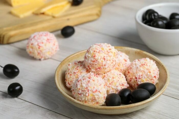 Сформируйте в руках шарики и каждый обваляйте в стружке из красных крабовых палочек. Перед подачей обязательно остудите шарики в холодильники.