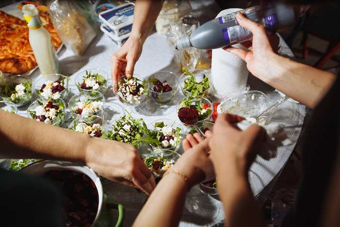 С едой, как и родственниками, мне повезло нереально. Маша, моя жена, серьезно увлекается поварским искусством, и даже заканчивала известную французскую кулинарную школу, а вот практики готовить на такое количество людей у нее еще не было. На мой вопрос: «Будем ли мы заказывать кейтеринг?», она однозначно ответила, что «должна самолично пройти через все это», плюс прилетела ее мама из Тольятти поздравить меня и помочь с готовкой. Они вдвоем за несколько дней все приготовили и организовали шикарный фуршетный стол. Посуду частично брали в лофте, частично покупали одноразовую, но интересную, чтобы хорошо смотрелась.