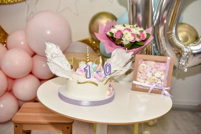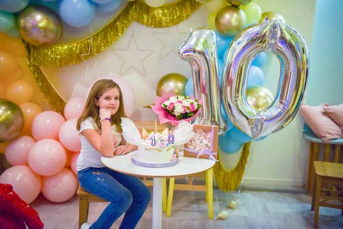 Единорожья тематика прослеживалась и во всей вечеринке. Но, поскольку девочка уже довольно большая, мы обошлись без плюшевых зверей и детских картинок. Фотозону оформили шариками тех цветов, которые встречаются в гриве единорога: золотой, розовый, мятный. Фотозону делали профессиональные дизайнеры, она была очень интересная, не арка, и не шарики пучками, а целая стена из шаров разного цвета и размера. Очень необычная и стильная.