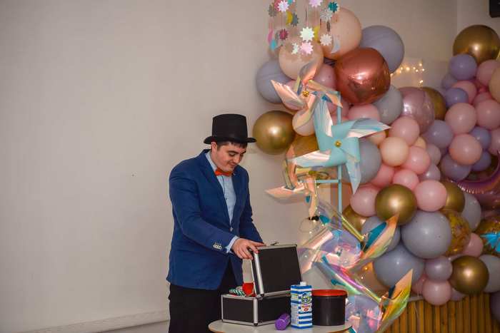 В начале вечеринки дети подарили Веронике подарки и поучаствовали в небольшой фотосессии – для этого у нас была приготовлена фотозона. Когда гости собрались, начался мастер-класс по слаймам. Все дети смогли сделать себе эти штуки, и потом, когда был небольшой перерыв на свободную игру, как следует наигрались с ними. Затем детей занимал фокусник. У него была программа, в которой были максимально задействованы дети, они сами делали фокусы и чудеса, детей от него было не оттащить, так что во время его выступления взрослые могли спокойно общаться.
