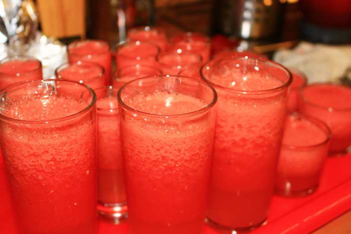 У нас была арбузная вечеринка. Я попросила гостей надеть наряды красного или зеленого цвета и сами мы были одеты в красное. Пространсво украсили воздушными шариками подходящих цветов. На самой вечеринке все было связано с арбузом: был надувной мяч-арбуз, много свежих вкусных съедобных арбузов, салфетки и шары с данной тематикой, даже маникюр у меня)). Делали фреш из арбуза, и провели конкурсы, где главным атрибутом был арбуз. В кулинарном конкурсе 2 команды гостей должны были приготовить фруктовый салат, где главным компонентом был, арбуз. В другом конкурсе необходимо было съесть дольку арбуза, на скорость.