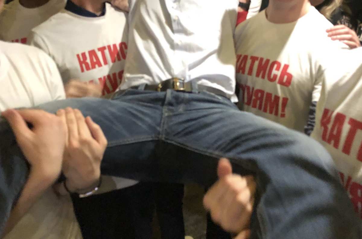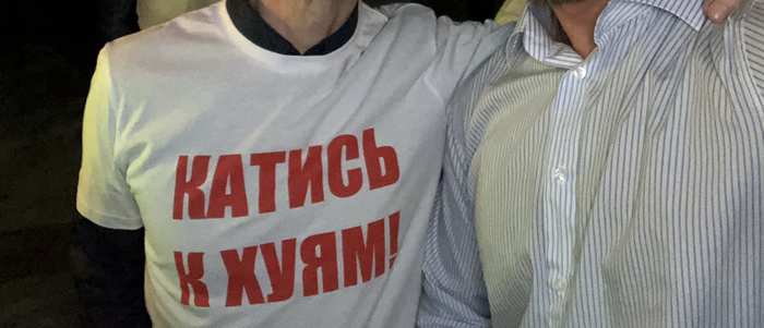 В течение вечера мы только общались, выпивали и хохотали)) Никакого пафоса. Зато был офигенный сюрприз от друзей! Пока несколько человек меня отвлекали, все гости надели футболки с надписью: «Катись к хуям» (ну это у нас юмор такой)! Было очень приятно и ржачно!!!