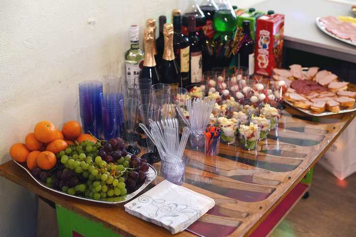 Фуршетный стол накрывали своими силами: были пара салатов, бутербродики, легкие закуски, сладкое, фруктовые салаты. Дополнительно заказывали пиццу. Торт был простой, но очень вкусный, пекла его одна из наших подруг. Алкоголя было немного, а выпили его еще меньше, поэтому, кстати, необходимости в бармене не было.