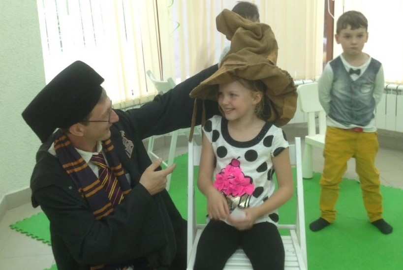 Как мы и планировали, сначала мы запустили на проекторе фильм, как Лиза летала на метле, все были в восторге, кажется, все дети поверили, что она на самом деле летала. А Лиза хитро подтвердила. Получился такой экскурс в историю фильма и погружение в его атмосферу, даже аниматор удивился, как мы так круто подготовились. По завершению фильма вышел Гарри Потер и начал распределять с помощью волшебной шляпы в две команды и дальше понеслось, был какой-то конкурс с зельем - плохо пахнущие и склизкие зеленые субстанции смешивали и получали крем для рук - они были в таком восторге. В общем все остались довольны, даже несмотря на то, что некоторые еще не смотрели Гарри Поттера, магия - это всегда интересно.