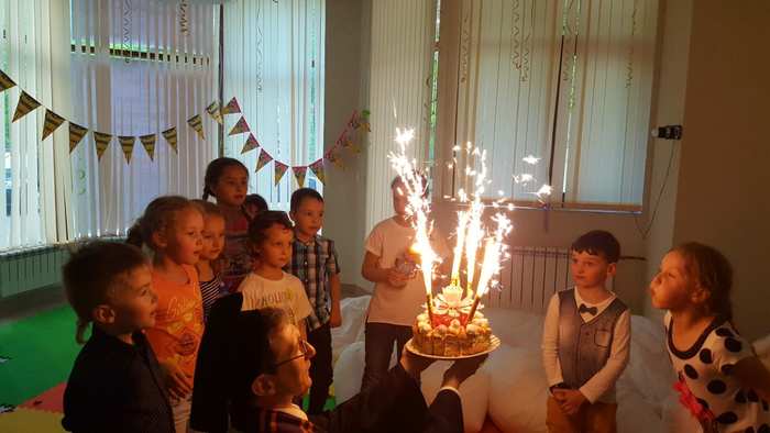 Из еды была пицца - 8 штук на заказ, а еще мы сделали домашние котлеты, нарезали морковки, яблок, бананов, купили маленькие бутылки воды, чтобы у каждого была своя, ну и сок, а взрослым кофе/чай и сельдерей с редиской (мамочки же). В завершение домашний торт от бабушки, в который мы вставили яркие свечи в виде фейерверка. Родители просто общались, алкоголя не было.