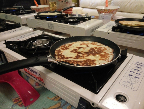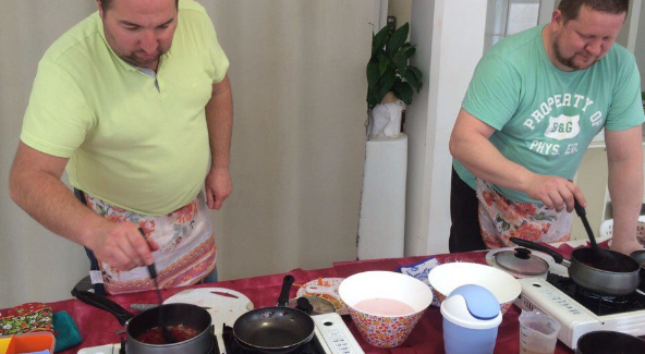 Мы всегда собираемся в одном из лофтов, такой формат для нас очень удобен. Мы перепробовали несколько помещений, но в последнее время остановились на одном месте. Оно для нас идеально подходит. Мы можем сделать все так, как нам удобно. Для нас важно, чтобы мы могли обустроить рабочее место для каждого участника мастер-класса – в отличие от некоторых других кулинарных курсов, где практикуется разделение труда у нас каждый участник готовит свое блюдо от начала и до конца. У каждого есть плита, кастрюлька сковородка, нож и прочее. Всю посуду и для приготовления блюд, и для сервировки стола мы приносим с собой, у нас есть также электроплитки. Нашим участникам мы выдаем фартуки.
