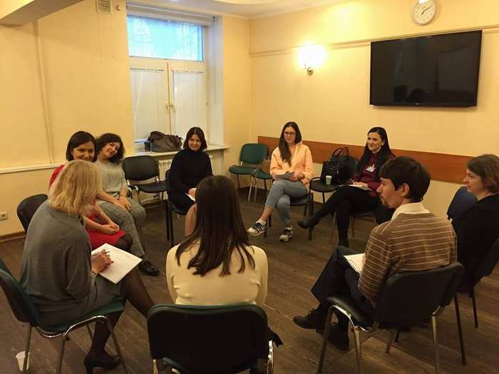 Супервизор показывает, как взаимодействовать с клиентом, или разбирает отдельные кейсы. Мы не используем ни проектор, ни микрофон, только иногда флипчарт. Расположение участников всегда круговое.