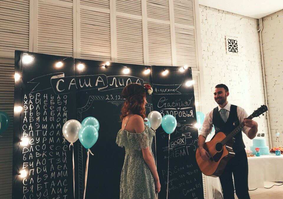 Мы все организовывали и украшали сами. Поскольку мы выбрали для нашей свадьбы мятную тематику, то подготовили декор в этой цветовой гамме – воздушные шарики, бумажные гирлянды из сердечек. Кроме того, мы украсили лофт живыми цветами и привезли большую меловую доску, которую разрисовали в свадебной стилистике (ее использовали как фотозону).