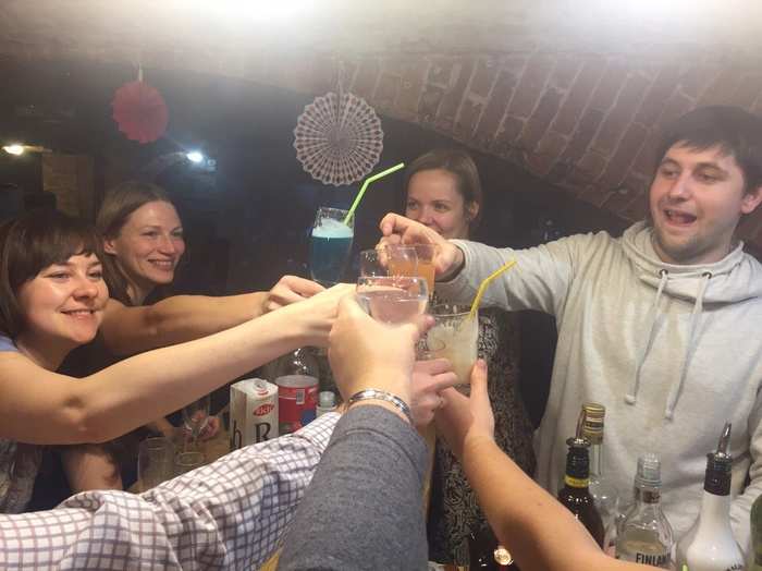 В бармена переквалифицировался мой муж. Самой мне за стойку встать не удалось, все время общалась с гостями. Мы выписали заранее несколько универсальных рецептов, таких как «Белый русский» «Пина колада», закупили необходимые ингредиенты. А потом начали уже экспериментировать - придумывали какие-то свои рецепты коктейлей, потом уже и кто-то из гостей тоже пробовал себя в роли бармена.