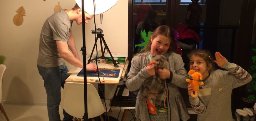 В студии, которую мы выбрали, мастер-класс проводили двое ведущих – молодые люди, которые сами придумали и создали эту студию. У них был с собой проектор и все необходимые материалы для творчества. Мы сразу сказали потенциальным гостям, что будем делать мультики, так что все, кому это не было интересно, отсеялись сразу, а те, кто пришел, были увлечены процессом. Хотя мне все же показалось, что десятилетние дети уже с меньшим энтузиазмом занимаются такой деятельностью, так что скорее этот мастер-класс подойдет на 7-9 лет.