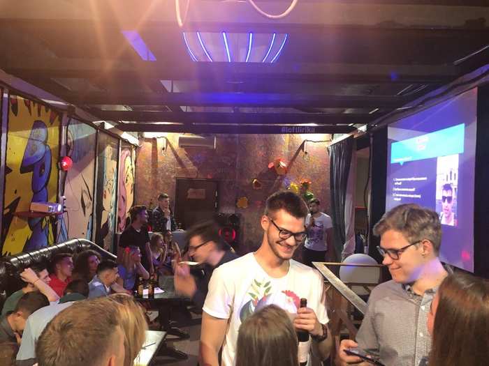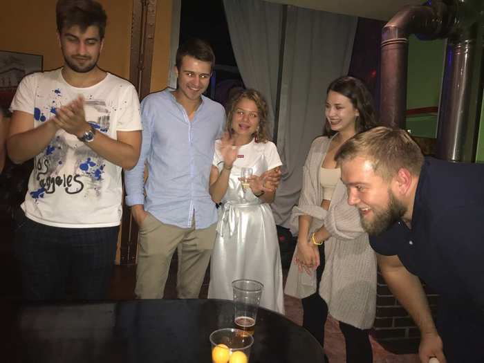 В процессе игры все перезнакомились, а потом разделились по интересам. Круто, что лофт так устроен, что можно было выделить разные локации. В одной части лофта у нас были музыка и танцы, а в другой мы устроили турнир в бирпонг. Играли по классическим правилам с пластиковыми стаканчиками, пивом и теннисными шариками. Сделали турнирную таблицу. Правда никакого приза для победителя не стали учреждать, только почет и уважение.