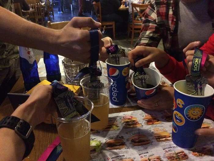 Но, в любом случае, все разговоры так или иначе сводятся к спорту: кто к какому забегу готовится, какие впечатления привез, как тренируется или какую книгу прочел. Иногда специально приносим на встречи медали со стартов — предмет особой гордости. Еще у нас есть карта мира, где по итогу года мы отмечаем новые точки, в каких уже бегали, или планируем. Милан, Берлин, Чикаго, Стамбул, Москва, Питер, Сочи — география участия очень разнообразная. Как-то перед стартом рисовали плакаты для болельщиков — мы часто поддерживаем бегунов во время старта или участвуем в забегах в роли волонтеров.