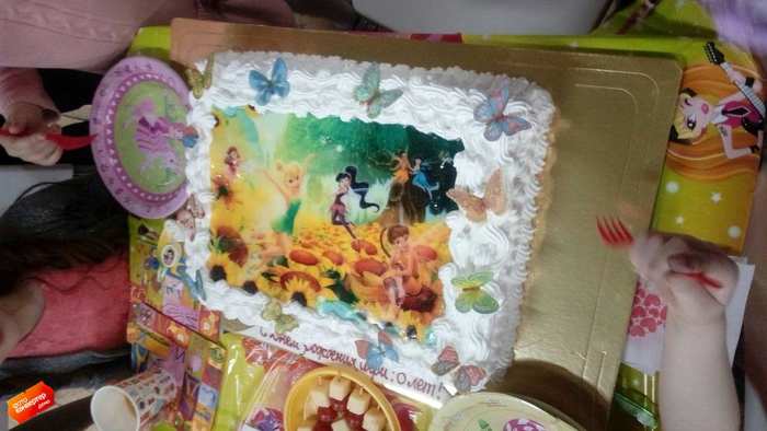 У детей был свой стол, для них заказывали детскую еду в кафе заранее. Сладкого было мало, в основном это были куриные шпажки с томатами черри, картофельные улыбки, много овощей, пицца, разные канапешки, фрикадельки из курицы. И, конечно, был красивый торт по заказу именинницы. Она пожелала торт с изображением феи Динь-Динь, так что сделали четырехкилограммовый торт с фотопечатью, его хватило и детям и мамам.