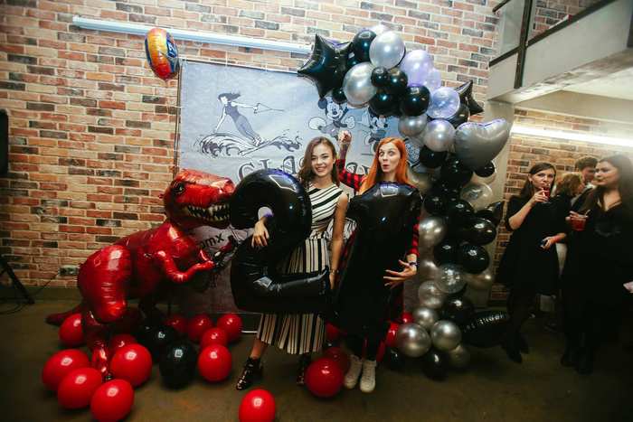 Я решила, что мне обязательно нужна фотозона, ведь это очень круто, и я через коллег из отдела маркетинга нашла замечательного Стаса-рекламщика, который и посоветовал мне моего дизайнера по пресс-волу. Я рассказала идею, дала параметры желаемого пресс-вола, и уже через 5 дней он был готов и лежал у меня дома. Посередине пресс-вола написано, что у меня День рождения, а по кругу нарисованы мои увлечения (бмх, вейкборд, татумашинка, кроссовки). Круг аниматоров очень широк, и с украшением пространства мне здорово помогали девочки с работы, они занимались фонтанами и фантазийной аркой. Это было очень сложно - нам надо было уложиться в один час, предоставленный нам в лофте для украшения зала, и одна я бы просто не справилась. Я хотела, чтоб всё было бело-красно-черным, и поэтому шары были именно в этой цветовой гамме.