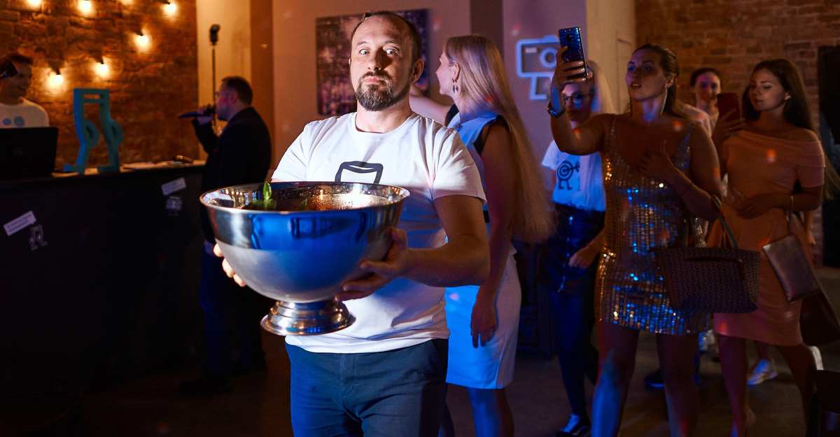 Пока бармен готовил шейк из лесных ягод, гости успели съесть половину закусок. Чтобы спасти вторую половину - под звуки волынки появился я. Есть такая шотландская традиция, она же народная мудрость: "Если хочешь, чтобы люди шли за тобой, возьми в руки выпивку и носи по кругу". Вообще-то шотландцы используют деревянную чашу. Мы такой не нашли, но купили самую большую металлическую, которая была в магазинах Петербурга.