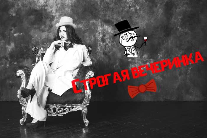 Я придумала название Строгая вечеринка. В приглашениях, которые я сделала, и в группах в соцсетях я попросила всех гостей одеться строго и элегантно: цветовая гамма белый и черный бабочки, галстуки. В общем, соответствовать тематике.