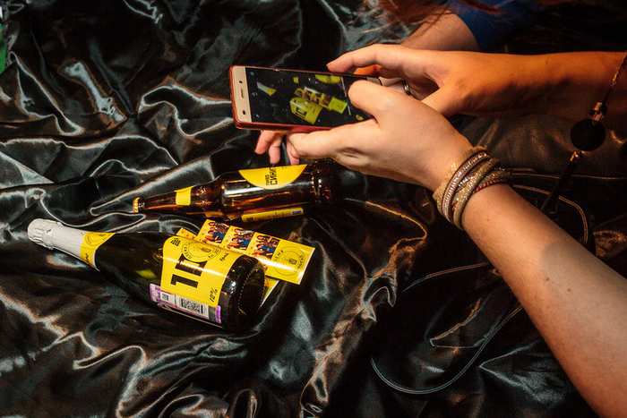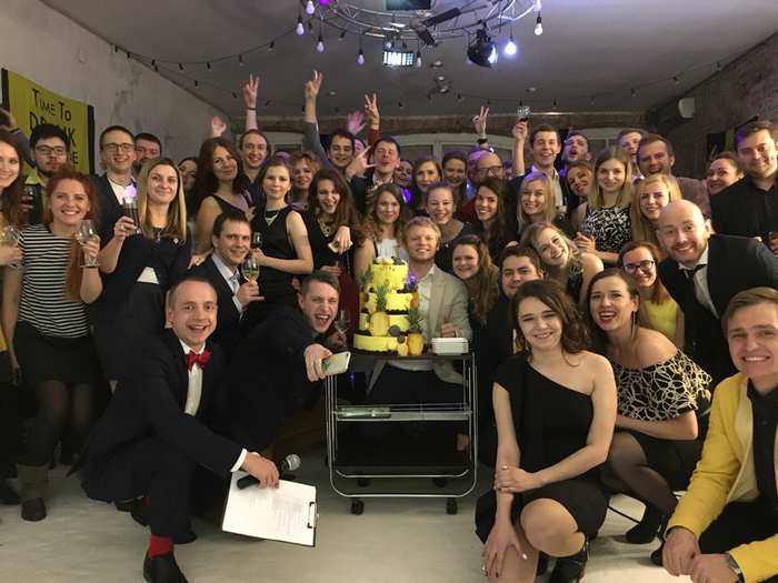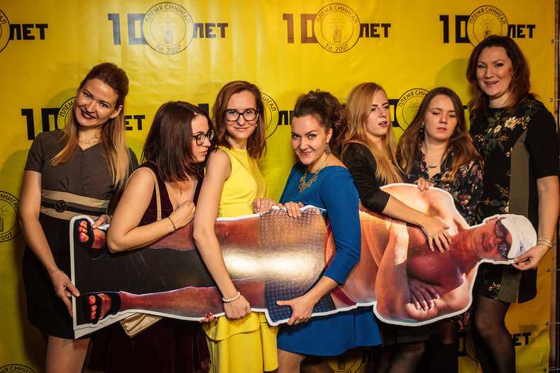 Мы подготовили пресс-волл, разместили в зале черные и желтые аутентичные предметы, развесили флаги нашего племени. А еще заказали несколько бутылок шампанского с тематическими черно-желтыми этикетками и надписью «10 лет племени» и большой и вкусный чёрно-жёлтый торт.