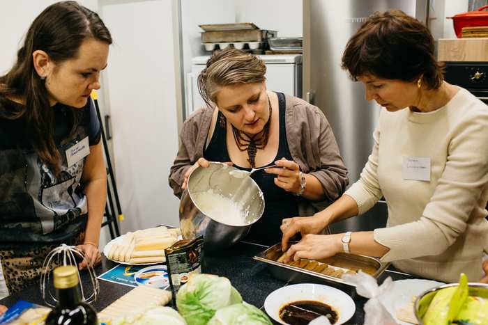 Обычно я приглашаю на такие мастер-классы не более 17 человек. На этот раз собралось 15 гостей, в том числе несколько детей. У меня у самой двое детей, и я очень рада, когда мои ученицы приходят с детьми, и предусматривают отдельное пространство, где дети смогут провести время. А на этот раз дети вообще помогали нам и готовили вместе с нами.