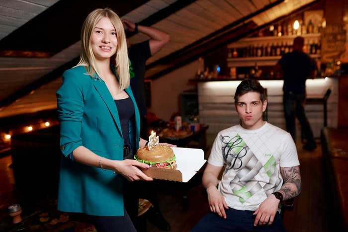 Алкоголь лился рекой, за это отвечал бармен Владимир – были водка, виски, вино, шампанское, танцы обеспечил ди-джей Кирилл, который отлично уловил настроение нашей компании. Веселье мы устроили себе сами, а снимал все это замечательный фотограф Антон. Владельцы бара, где все проходило очень помогли мне с фуршетом, потратили на него целый день и гости все смели до последней крошки. Но и сами в долгу не остались. Друзья знают, что я большой любитель гамбургеров и подарили мне большой сладкий гамбургер-торт.
