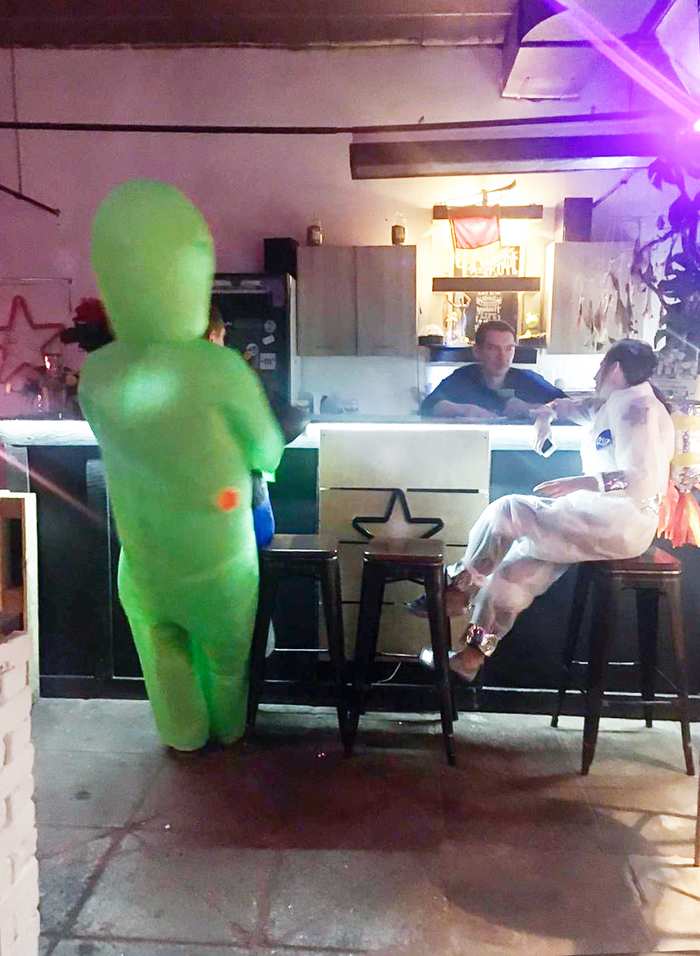 Гости тоже не подкачали. Многие, конечно, не стали мудрить и пришли в черном. Мы их так и назвали — черные дыры, вполне космически) Но часть гостей очень порадовала костюмами и купленными, и сделанными самостоятельно. Была парочка астронавтов, зеленый инопланетянин и космические принцессы. Я сама выбрала офигительное серебряное платье длинное и в обтяжку.