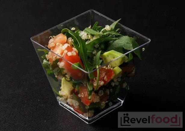 Салат традиционно присутствует на праздничном столе. Что бы на фуршете данное блюдо смотрелось уместно, салатами наполняются стаканчики. Порционный стакан может быть пластмассовый или стеклянный. К ним подаются небольшие вилки или ложки. Благодаря этому кушать их можно даже стоя.
