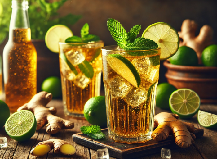 Очищенный нарезанный имбирь сварите и дайте настоятся минут десять. Отвар процедите и вылейте его в кастрюлю. Добавляя сахар, доведите до кипения. Получившийся сироп вылейте в банку с крышкой и уберите в холодильник. Это основной ингредиент коктейля. Перед вечеринкой возьмите стаканы. В них добавьте лед, листья мяты, и сок кусочка лайма. Затем в стакан наливайте газированную воду и имбирный сироп. Такой коктейль будет популярен за столом в летнее время.
