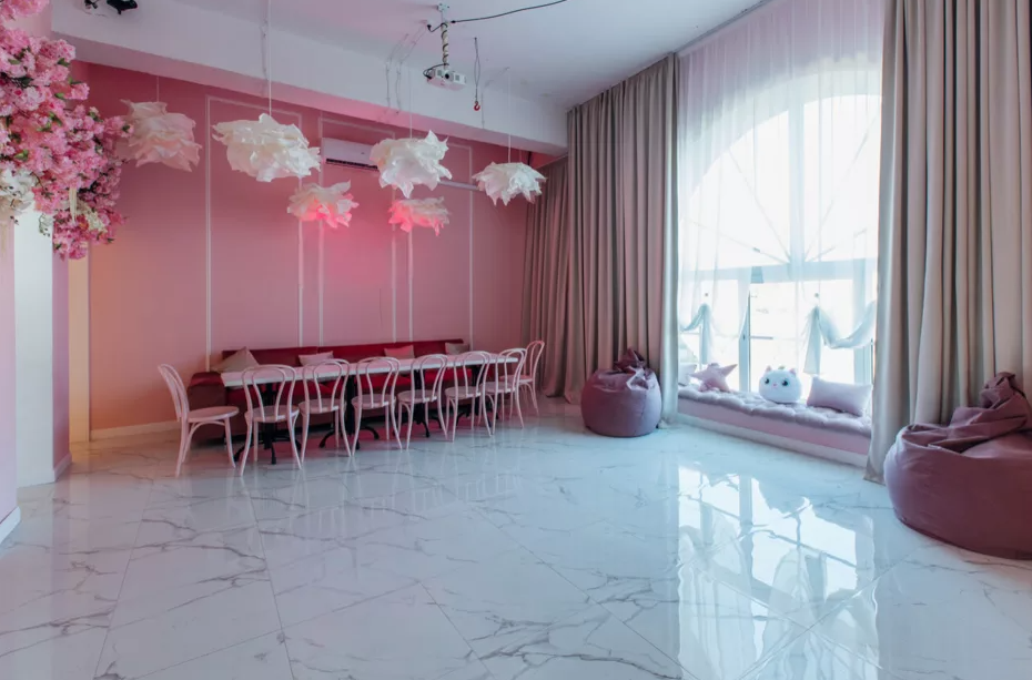 Прекрасный лофт в нежно-розовых тонах идеально подходит для девичника, праздника и просто встречи с подружками.