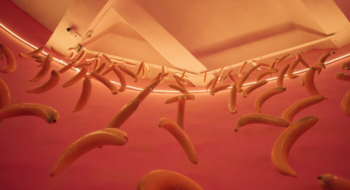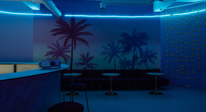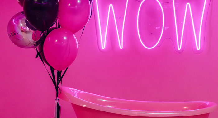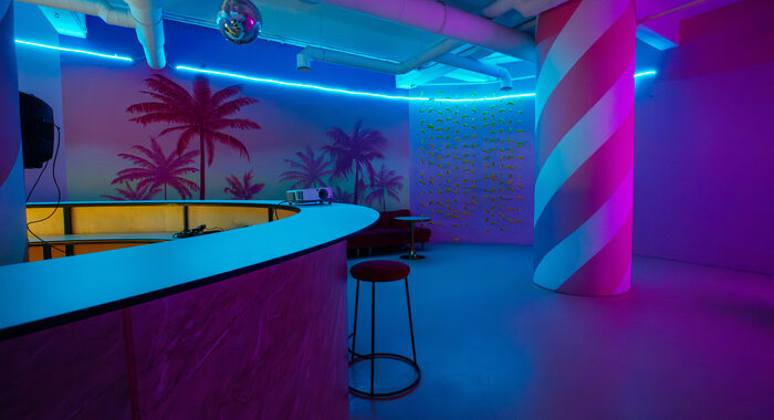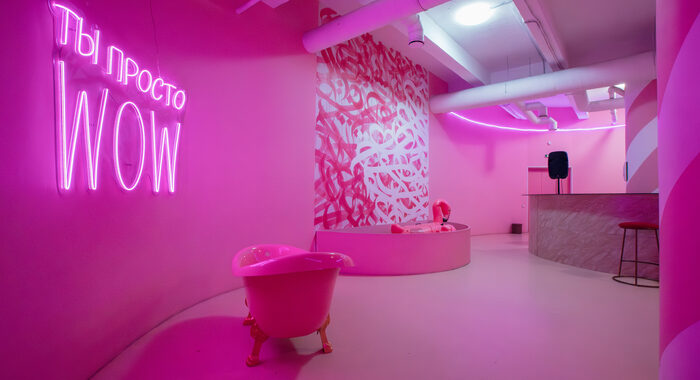 Первое, что бросается в глаза — стильный розовый дизайн и неон, который меняет цвета: от нежного голубого до дерзкого красного.