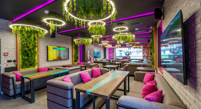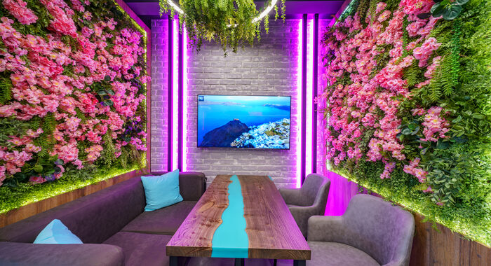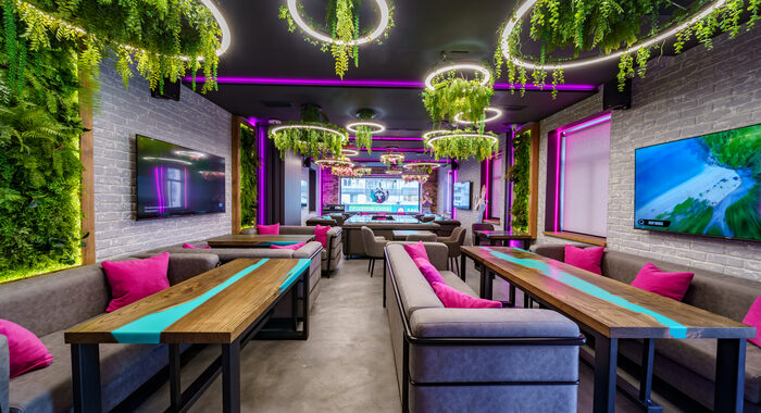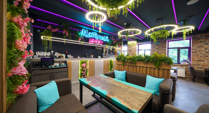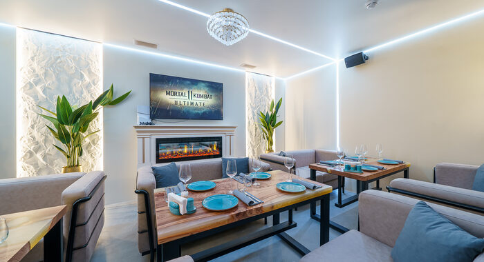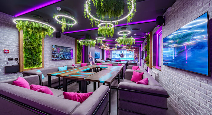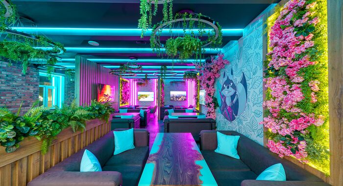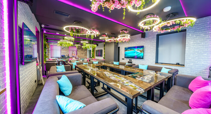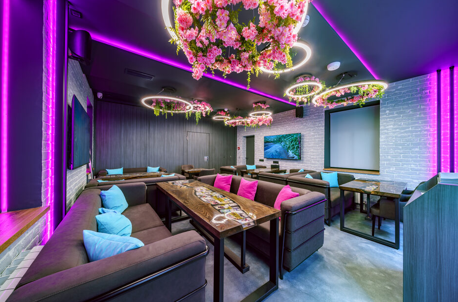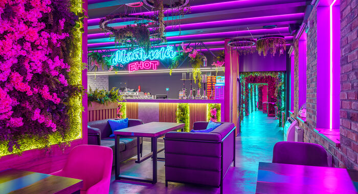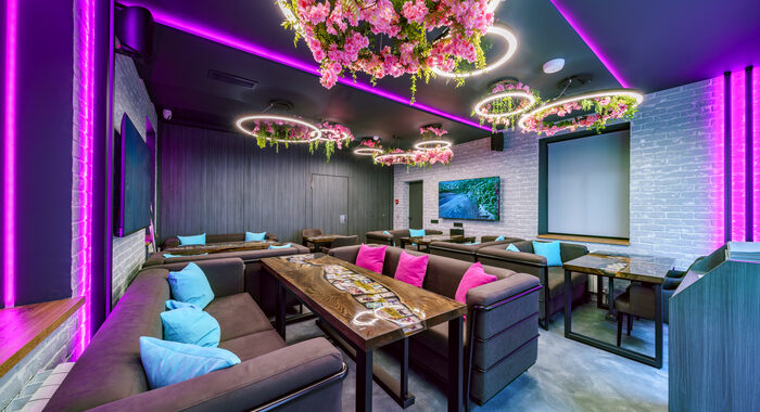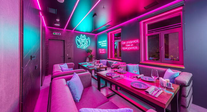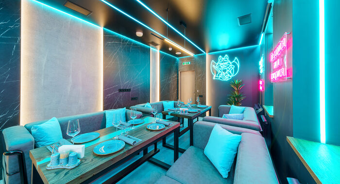 Стилизованный банкетный зал с неоном размещен на нашем сайте не так давно, но пользуется популярностью. В нем проводят корпоративные мероприятия и личные праздники. В нем с комфортно могут разместиться сорок гостей. Помимо прекрасного дизайна и неоновых подсветок по всему периметру, в нем есть игровые приставки, цифровое ТВ, музыкальная аппаратура и Вип-комнаты. На площадке гости смогут заказать еду и напитки или же принести с собой. В этом ограничений нет.