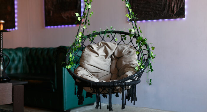 Основные цвета в дизайне - белый(стены) и черный(потолок). Но есть и и яркие акценты: картины с неоновой подсветкой, необычные люстры. Мягкая мебель только кожаная, есть удобное подвесное кресло.