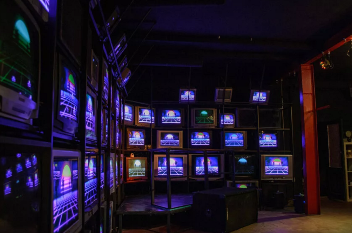 Внутри — старые телевизоры, стенды с афишами, кресла, диваны, уголки с кассетами и бытовой техникой того времени.