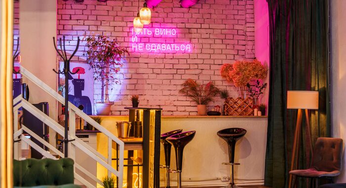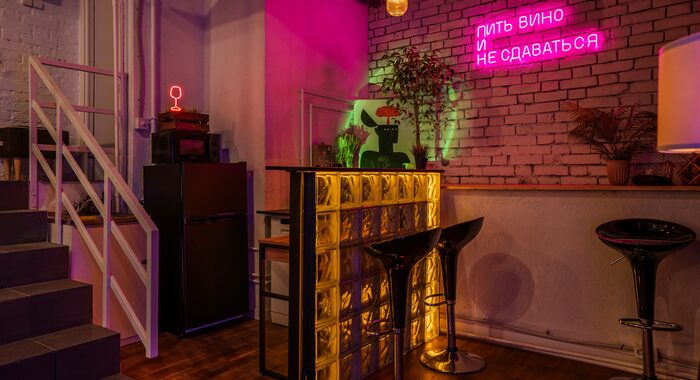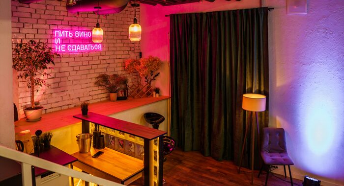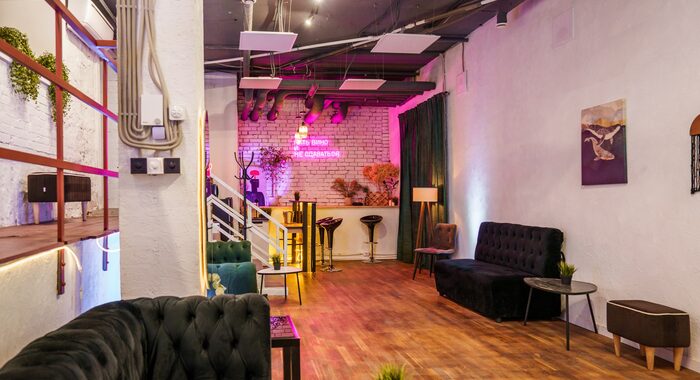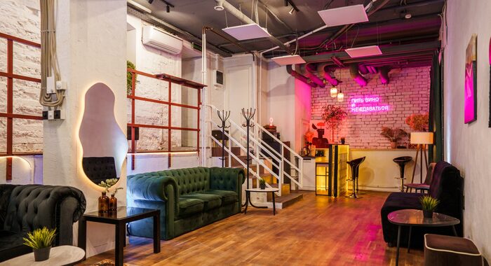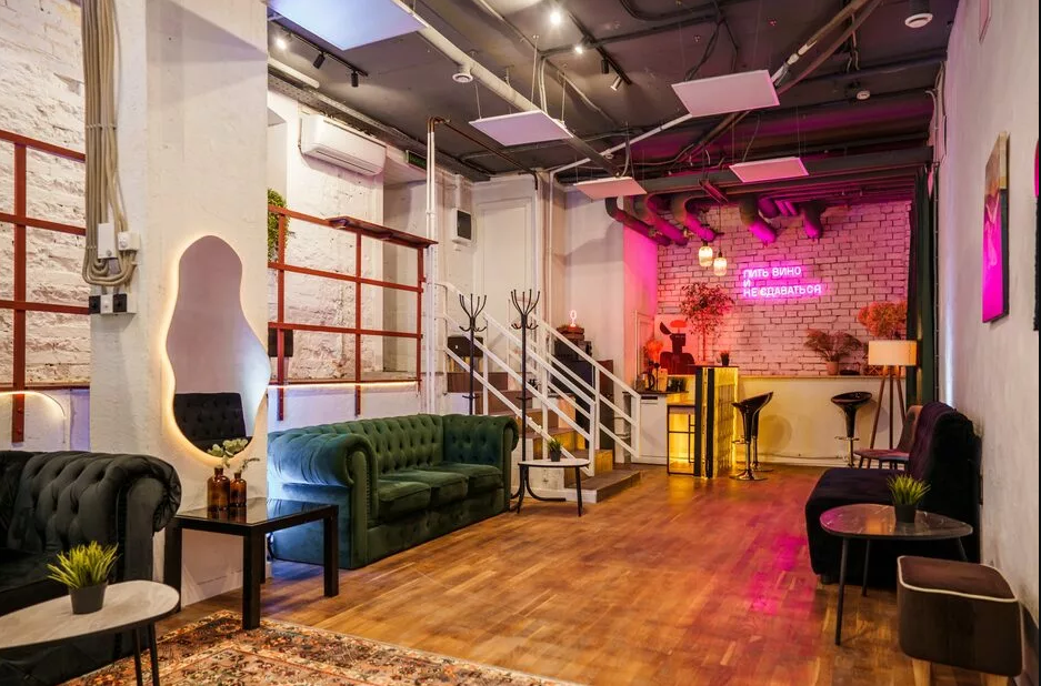 Дизайн Verde Loft — это гармония света, стиля и функциональности. Просторное светлое помещение с отдельным входом создает ощущение свободы и приватности одновременно. Здесь панорамные окна наполняют зал естественным светом днем, а вечером включается магия встроенного освещения. Интерьер выполнен в современной лофтовой эстетике с индустриальными акцентами, кирпичными стенами, бетонными фактурами и теплым деревом. Пространство делится на несколько зон: основную танцевальную площадку, уютную лаунж-зону с диваном и барную стойку — каждая деталь продумана для комфорта гостей и органичного течения любого события.