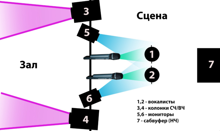 – организуйте зону сцены и расположите на ней все колонки так, чтобы не создавался резонанс от микрофонов
