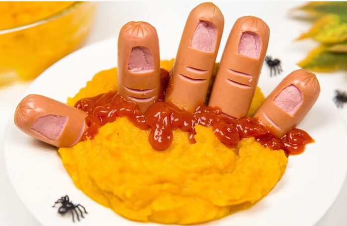 Для пюре подготовьте мякоть тыквы. Мякоть отвариваете в подсоленной воде до готовности. После в блендере измельчите с молоком и маслом. Если вы не любите тыкву, то приготовьте обычное картофельное пюре. Пюре выложите на тарелки и вставьте в него сосиски в виде руки ( см. фото).