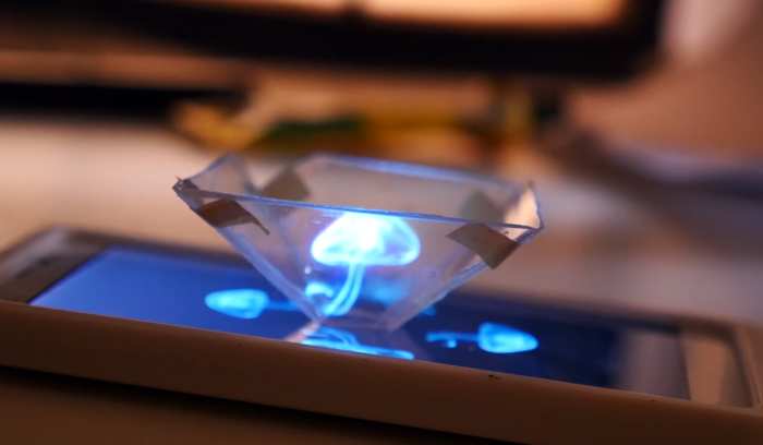 А вот это чудесное приспособление не имеет отношения к фотографии. Но может на несколько минут сделать вас центром внимания и настоящим волшебником. А стоит оно - копейки. От 50 до 100 рублей. Называется довольно солидно – портативный голографический 3д проектор. А на самом деле представляет собой конструкцию из прозрачных кусочков пластика, собранную в виде пирамиды. Секрет в специальных видеофайлах для голографического проецирования. Нужно найти соответствующие файлы в интернете или скачать подходящее приложение (Hologram) и сами увидите, что получится.